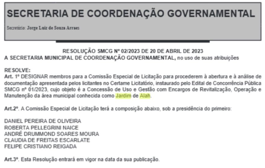 Será a tal Comissão de Licitação, a seu critério exclusivo, quem julgará o melhor conceito do futuro projeto urbano-paisagístico para o Jardim de Alah, bem público e bem cultural tombado da Cidade e, a partir do seu julgamento, o concederá por 35 anos ao empresário por ela escolhido. E tudo sem qualquer estudo de impacto ambiental ou estudo de impacto de vizinhança do futuro projeto básico a ser ainda elaborado, mas já eleito pela Comissão.