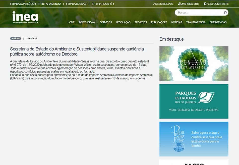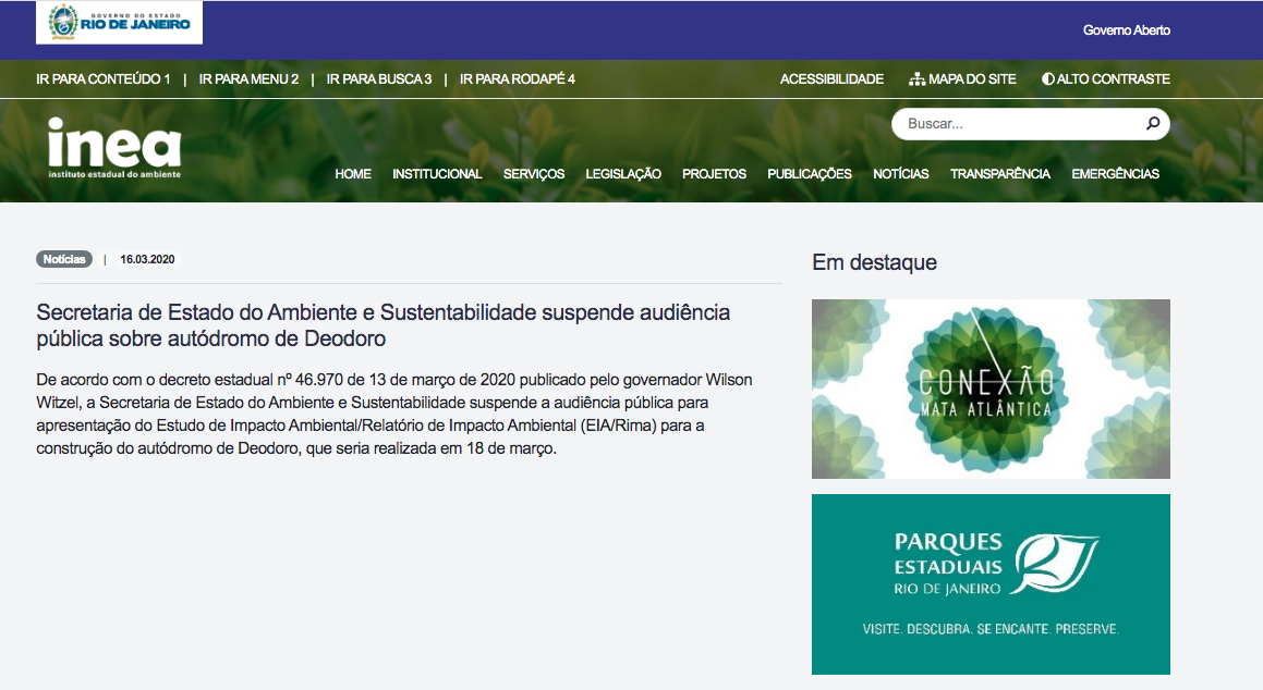 Na tarde desta segunda-feira, dia 16, o INEA (Instituto Estadual do Ambiente) do Estado do Rio de Janeiro voltou a publicar em seu site o edital da Audiência Pública para prosseguir, de qualquer maneira, com o licenciamento do Autódromo fake de Deodoro.