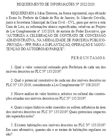 2º fato: A Comissão de Meio Ambiente da Câmara do Rio pede “informações” ao Executivo sobre o “projeto do Autódromo”. Com o pedido de informações, enquanto não for respondido, o projeto de lei que visa autorizar a doação de parte do terreno público ao investidor imobiliário (RioMotor) do autódromo não pode ter prosseguimento. Talvez, sem quorum para não aprovar o projeto, o jeito é atrasá-lo o quanto possível. A preocupação está na pauta parlamentar.