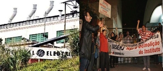 Dois pesos, duas medidas: poder público doa terras à GE, que abandonou um terreno em Maria da Graça (E) e, ao mesmo tempo, “despeja” e pretende demolir hospital do IASERJ, em pleno funcionamento (D)