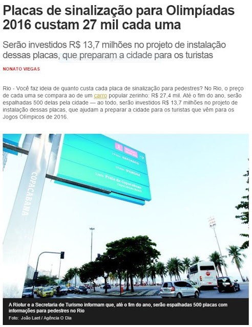 Neste artigo, a arquiteta Andréa Redondo registra a situação precária das placas placas “informativas”, hoje, tortas, enferrujadas, apagadas e que não cumprem a sua finalidade, pagas com dinheiro público. “Feitas de ferro, em muitos casos, instaladas à beira mar, durante a Olimpíada,ao custo de R$ 27,4 mil (!) cada. A ´ideia´ foi inspirada na experiência de Londres. Lá, entretanto, foram financiadas também pela iniciativa privada, a um valor bem menor, estimulam o comércio e agregam informações”, destaca.