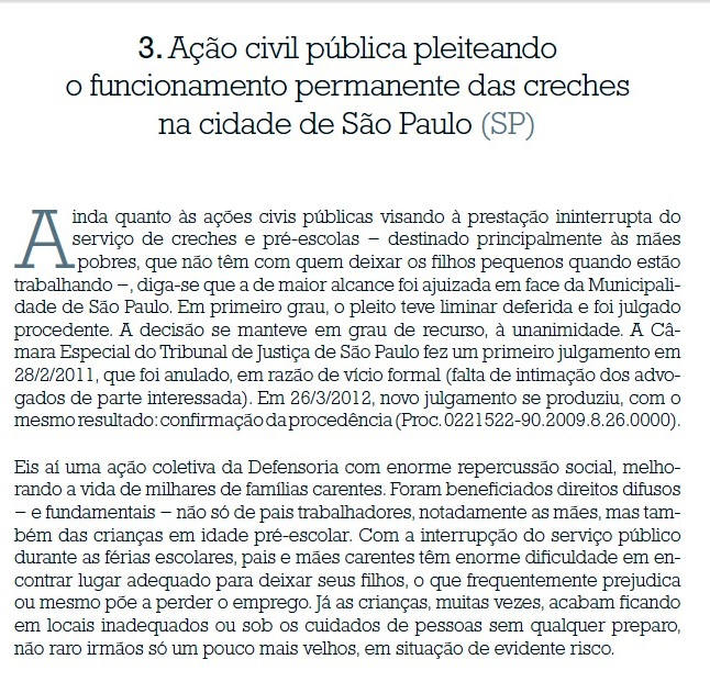 Esse serviço público essencial não foi obtido na Cidade de São Paulo por decisão da Prefeitura, nem por determinação de lei, mas por decisão judicial.É o que nos informa o I Relatório de Ações Coletivas da Defensoria Pública