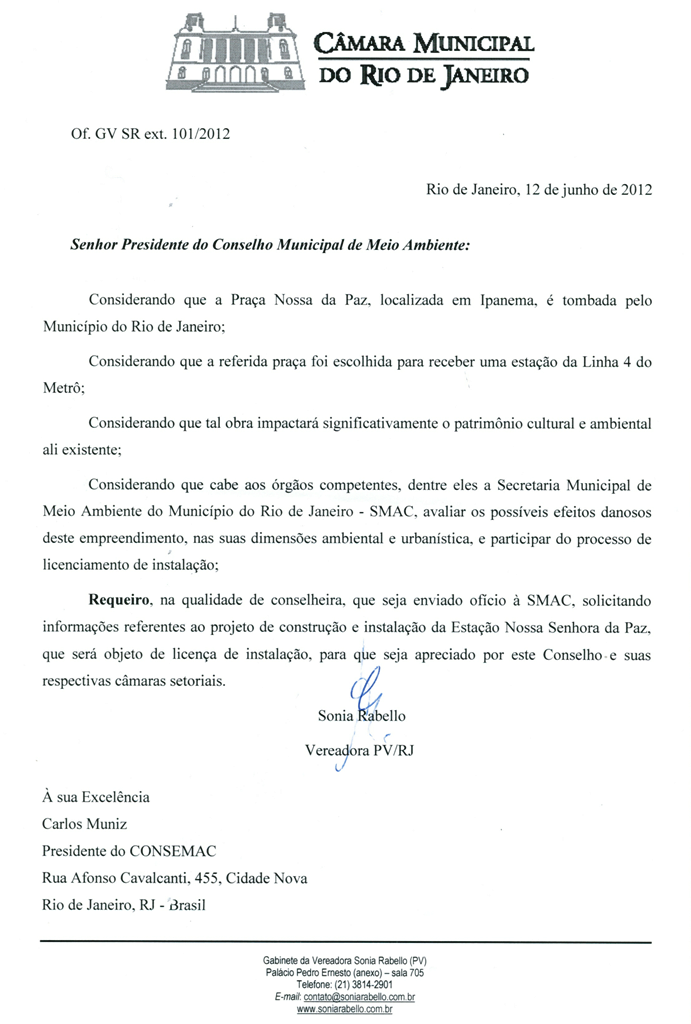 A vereadora Sonia Rabello, na qualidade de conselheira do Conselho Municipal de Meio Ambiente (Consemac), requereu o envio de um ofício à Secretaria Municipal de Meio Ambiente solicitando informações referentes ao projeto de construção e instalação da Estação de Metrô Nossa Senhora da Paz, em Ipanema.