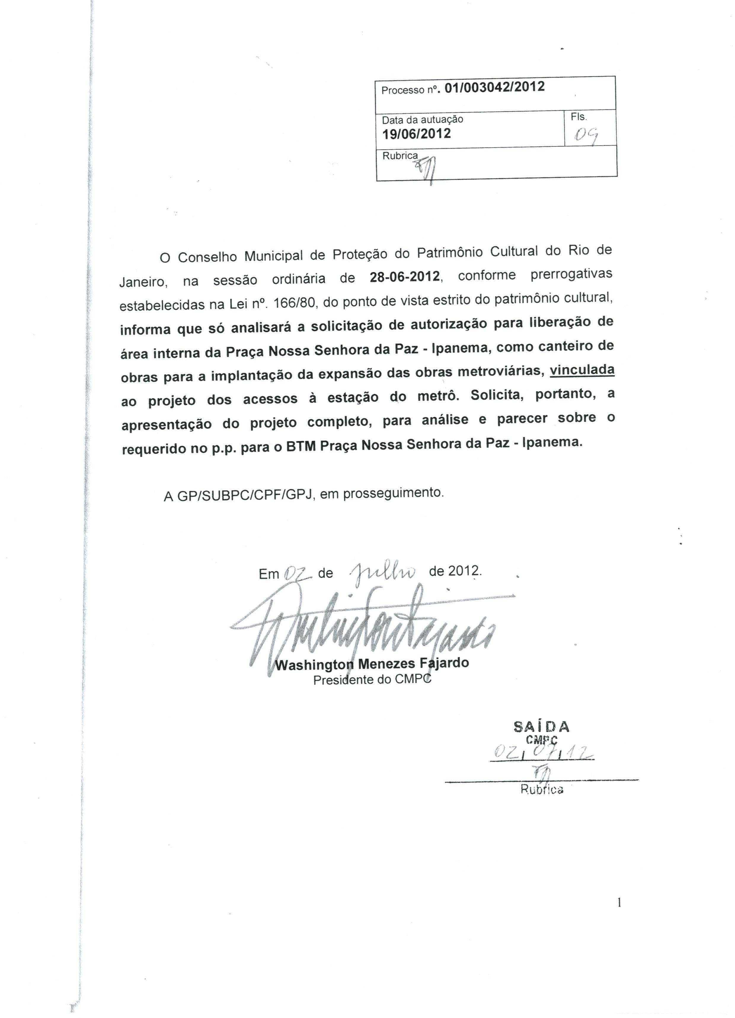 O Conselho Municipal de Patrimônio Cultural, por meio do seu presidente Washington Menezes Fajardo, informou que a autorização para liberação da área interna da Praça como canteiro de obras para a instalação da Linha 4 do metrô só acontecerá mediante apreentação do projeto completo.