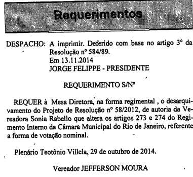 Qual não foi minha surpresa quando, na semana passada, vi publicado no Diário da Câmara, pedido do Vereador Jefferson Moura para desarquivamento deste projeto de minha autoria que obrigará votações nominais para todas as leis municipais no Rio.