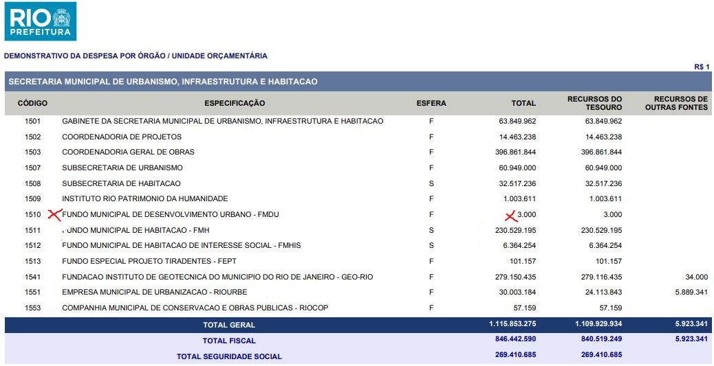 E, no minguado orçamento municipal de investimentos, o seu Fundo Municipal de Desenvolvimento Urbano (FMDU) tem a previsão da dotação R$ 3 mil! Ou seja, a Cidade do Rio de Janeiro tem um  FMDU fake!  Que atraso! Que vergonha!