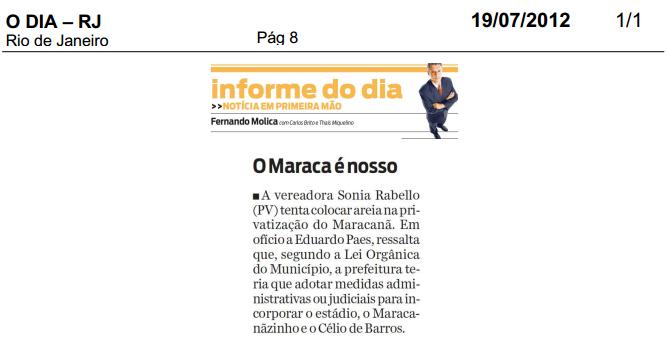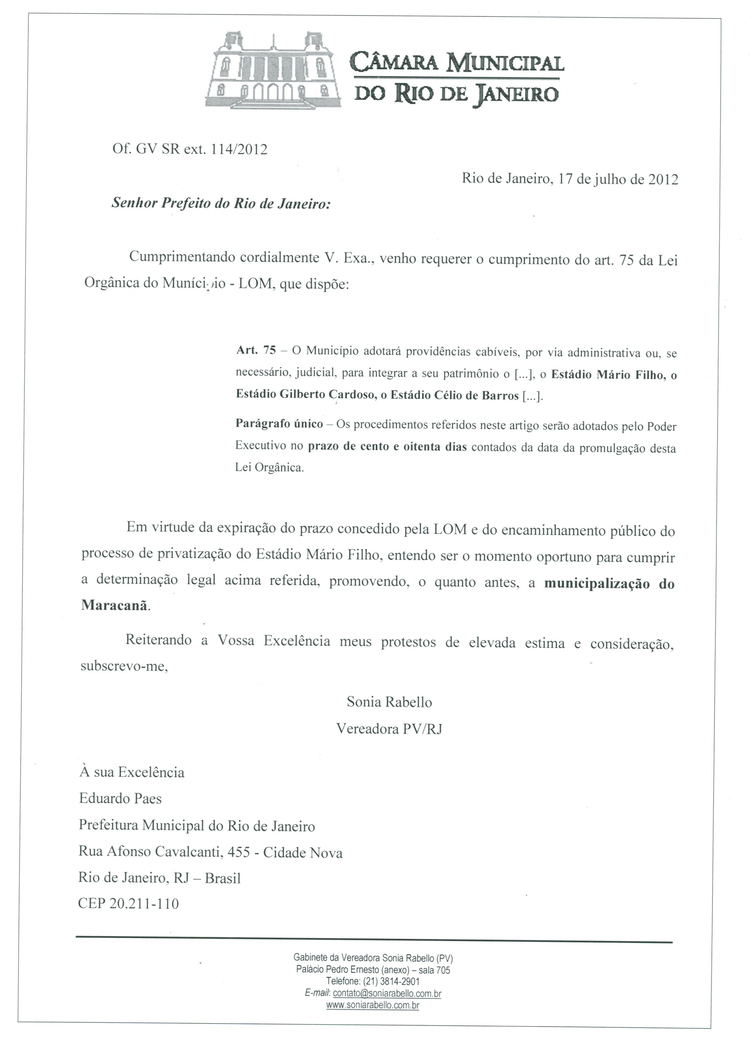 Na última quarta-feira, enviei um ofício ao Prefeito do Rio solicitando a municipalização do Complexo do Maracanã, em respeito ao artigo 75 da Lei Orgânica do Município.