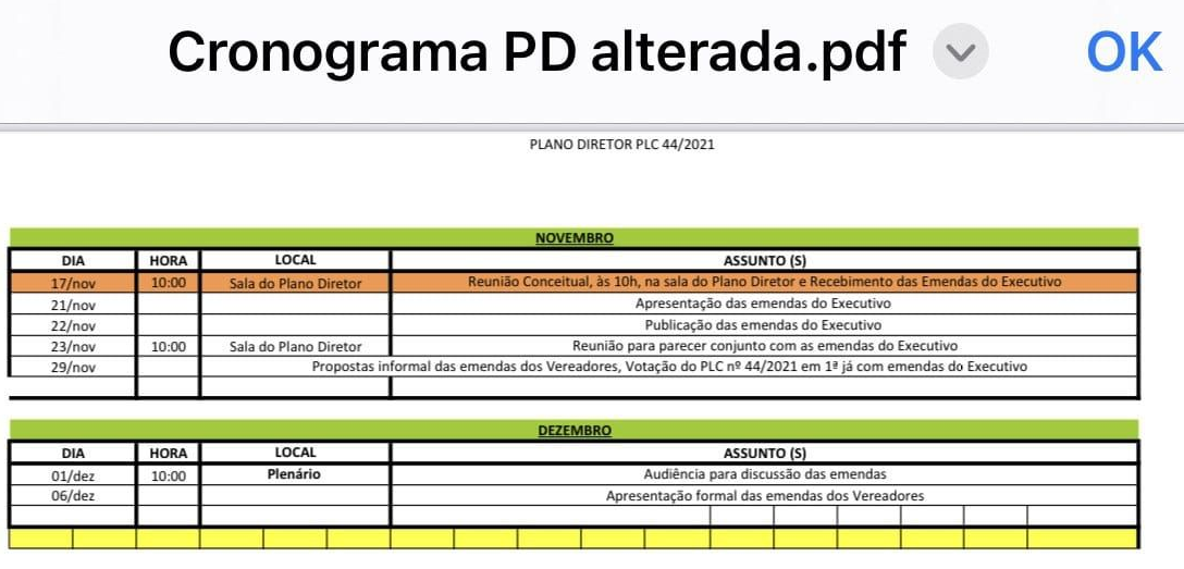 No documento publicado, somente no Diário Oficial da Câmara, foi estabelecido o prazo de 10 de novembro para que o Executivo enviasse à Câmara as emendas ao Plano Diretor e, outras datas seguidas em novembro para já votação do mesmo em 1ª votação, sem qualquer espaço adequado para divulgação de informações, oitiva e participação social.