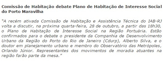 O que sugere esta assertiva é o convite, pelo Instituto de Arquitetos do Brasil – Rio de Janeiro (IAB-RJ)- Comissão de Habitação, para o “debate” sobre o PHIS – Porto, mais uma vez com a sua apresentação pelo presidente da CDURP, Alberto Silva. Confiram: